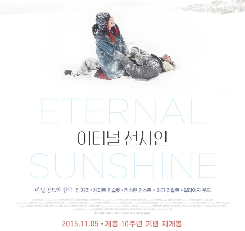 영화 이터널 선샤인(2004)은 제77회 아카데미 시상식 각본상 수사 그리고 여우주연상 후보작이기도 합니다. 2015.11.05 10주년 기념으로 재개봉까지 되기도 했습니다. 미셸 공드리 감독의 2004년 영화로 짐 캐리, 케이트 윈슬렛, 커스틴 던스트, 마크 러팔로, 일라이저 우드 등의 배우들이 출연했습니다. 특히 짐 캐리와 케이트 윈슬렛은 대한민국 사람들도 좋아하는 할리우드 스타들입니다. 특히 상항 코믹하고 약간은 모자란 연기로 많은 관객들에게 웃음을 선사하는 배우인 짐 캐리가 이 영화를 통해서는 상당히 진지한 연기를 선보입니다. 그렇지만 역시 영화 중간중간에 짐 캐리의 특유의 코믹한 연기기 첨가된 것도 사실입니다. 물론 트루면 쇼를 통해 짐 캐리는 정극 연기도 충분히 훌륭하게 소화해 낸 이력이 있습니다. 그래서 그런지 이번에는 실연에 슬퍼하는 남자의 연기를 할 수 있다는 것을 연출자들에게 어필을 한 것일까요? 짐 캐리 같은 코믹한 연기에 관객들이 각인되어 있을 텐데 과감하게 그를 믿고 슬픔에 잠긴 남자 배우역의 기회를 준 영화입니다.