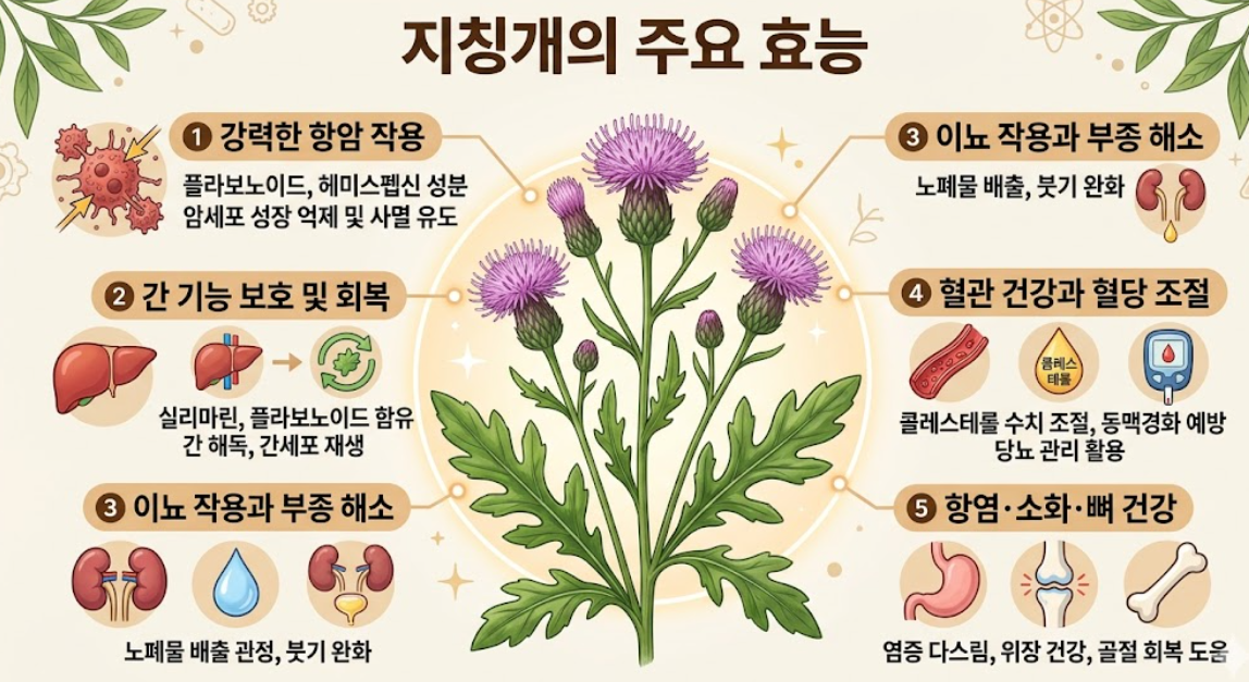 지칭개에 풍부한 플라보노이드와 헤미스펩신 성분은 인체에 유해한 활성산소를 효과적으로 제거합니다. 연구 결과 각종 암세포의 성장을 억제하고 사멸을 유도하는 강력한 항암 효과가 확인되었습니다. 값비싼 약재가 아닌 밭두렁 잡초에서 이 같은 효능이 나타난다는 사실이 연구자들의 이목을 끌고 있습니다.