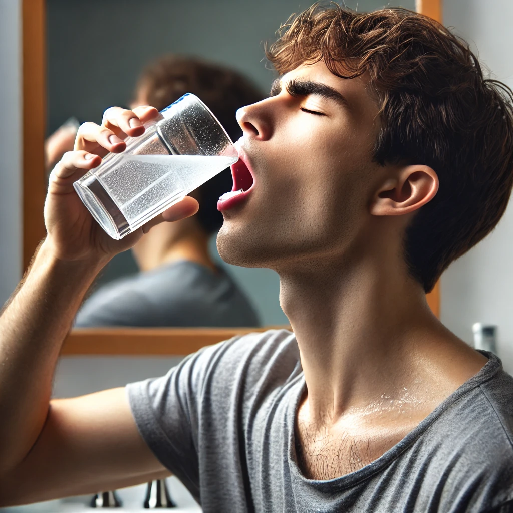 소금물이 완전히 섞인 후, 입과 목을 1분 정도 가글합니다. 소금물의 농도가 너무 진하지 않도록 주의하는 것이 좋습니다.
