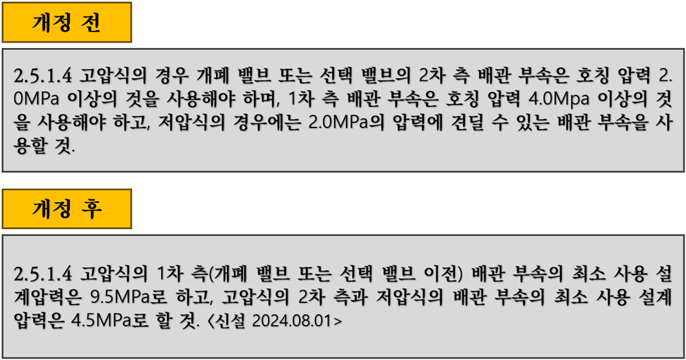 이제 여기서부터 좀 중요한데 개폐 전, 후 수치의 변동이 있어요. 고압 시계 1차 측 배관 부속의 최소 사용 압력은 9.5 MPa하고 고압 시계 2차 측과 저압 시계 배관 부속의 최소 사용 설계 압력은 4.5 MPa할 것. 고압식 1차는 9.5 MPa,고압식 2차 측은 4.5 MPa로 파로 바뀌었다는 점 기억해 두시면 됩니다.