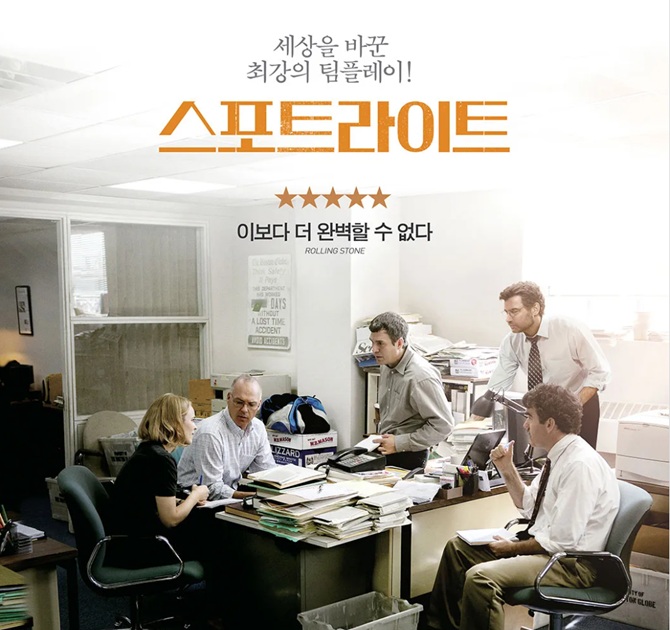 2015년에 개봉한 미국의 드라마 장르의 영화입니다. “보스턴 글로브”의 “스포트라이트 팀”에 소속된 기자들의 스토리를 다루고 있습니다. 실화(지난 2002년 한 사제가 수십 년에 걸쳐 어린이를 성추행한 사건)를 바탕으로 한 영화로서, 실제로 이 기사를 보도한 스포트라이트 팀은 퓰리처 상을 수상했습니다. 보스턴 가톨릭 사제들의 성추행 사건은 당시에도 큰 반향을 일으켰다. 이 영화는 그때의 사건을 생생하게 기록하며, 2016 아카데미 시상식에서 최우수 작품상과 각본상을 수상하게 됩니다. 물론 마크러팔로, 레이철 맥아담스, 마이클 키튼 등 할리우드의 연기파 배우들이 열정으로 연기했기 때문이기도 하다.