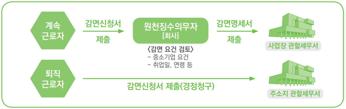 중소기업에 취업한 근로자가 감면신청서를 회사(원천징수의무자)에 제출하고, 회사는 요건 판단 후 관할세무서에 감면명세서를 제출합니다. (퇴직근로자는 직접 신청 가능)