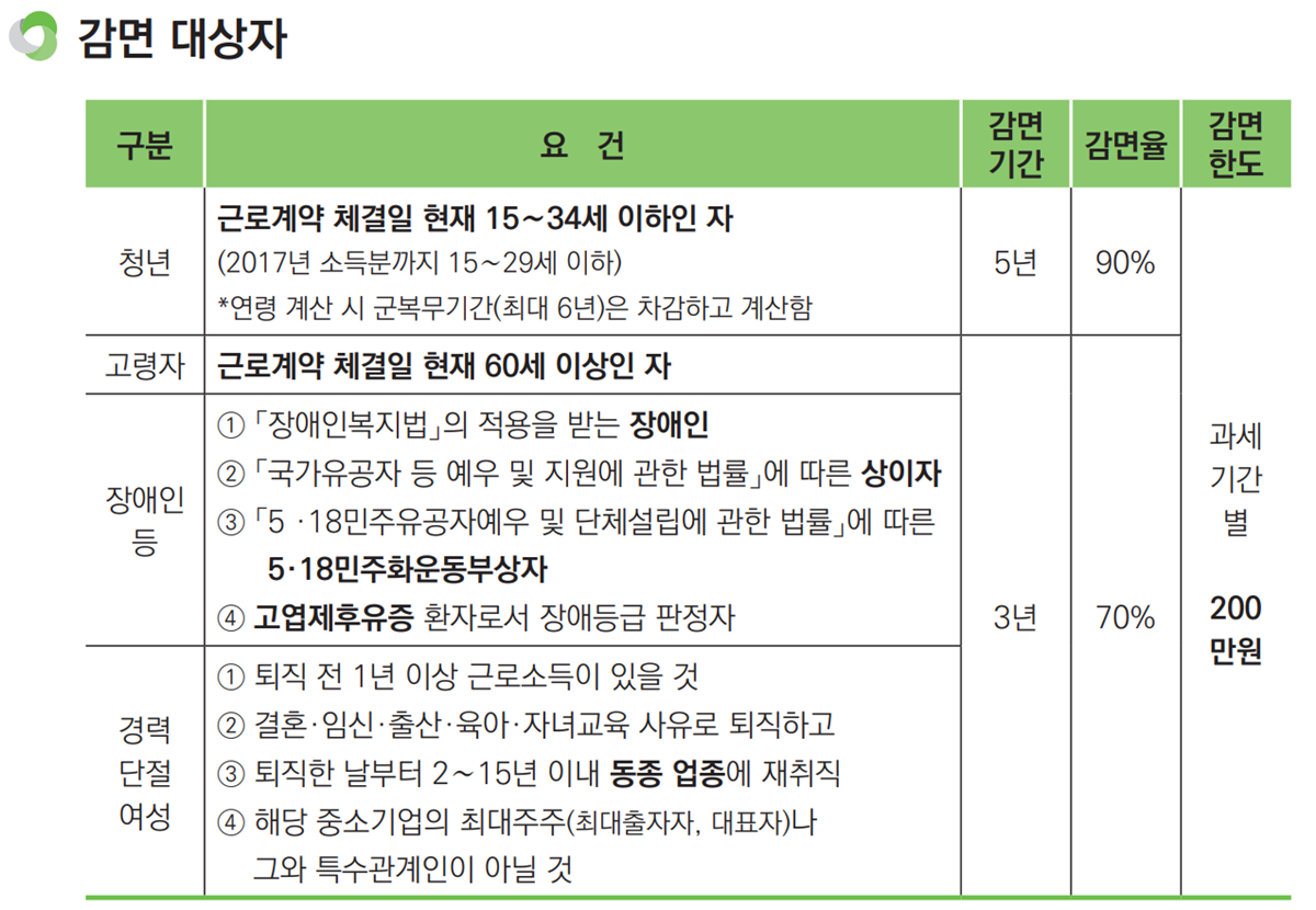 ’12년 중소기업의 인력지원 및 청년 취업난 해소를 위해 중소기업 취업자에 대한 소득세 감면 제도가 도입된 이래 세법이 개정되면서 그 혜택이 점차 확대되었으나, 잦은 세법 개정으로 인해 연도별로 감면 요건이 상이하여 근로자·회사가 감면대상 판단 등에 어려움을 겪는 경우가 있습니다.