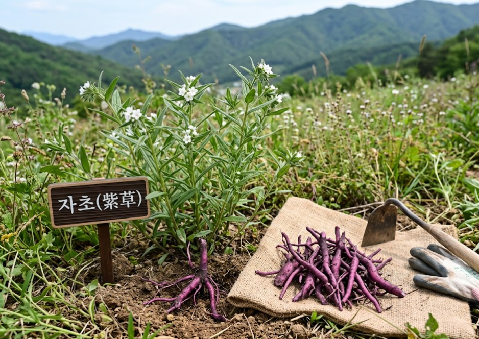 강원도 깊은 산 속에서 붉은빛이 도는 뿌리가 달린 식물을 발견했습니다. 바로 자초(紫草), 즉 지치입니다. 뿌리가 선명한 자주빛을 띠는 이 약초는 오래전부터 염료와 약재로 두루 쓰여왔고, 오늘날에는 항바이러스·항균·항염 효능과 암 신생혈관 억제 가능성으로 주목받고 있습니다.