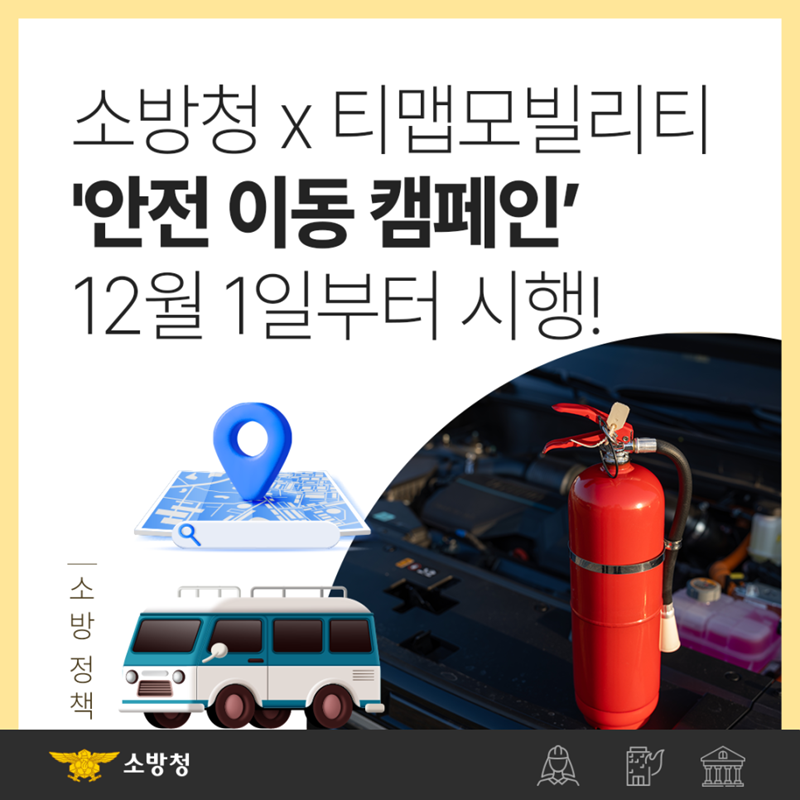 소방청은 티맵모빌리티와 함께 차량용 소화기를 증정하는 ‘씽크 세이프(Think Safe) 안전 이동 캠페인’을 전개한다고 밝혔습니다.
