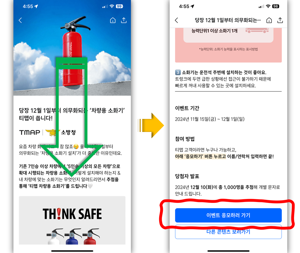 티맵 홈 화면에서 ‘차량용 소화기 응모하기’ 배너를 클릭하면 이벤트 페이지로 이동합니다.
