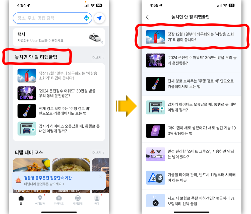 해당 페이지에서 차량용 소화기 의무화에 대한 정보를 확인한 후, 하단의 ‘티맵 차량용 소화기