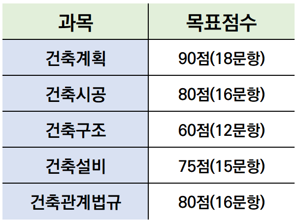어려운 과목은 **과락(8개 이하 정답)**을 피하는 데 목표를 둡니다.