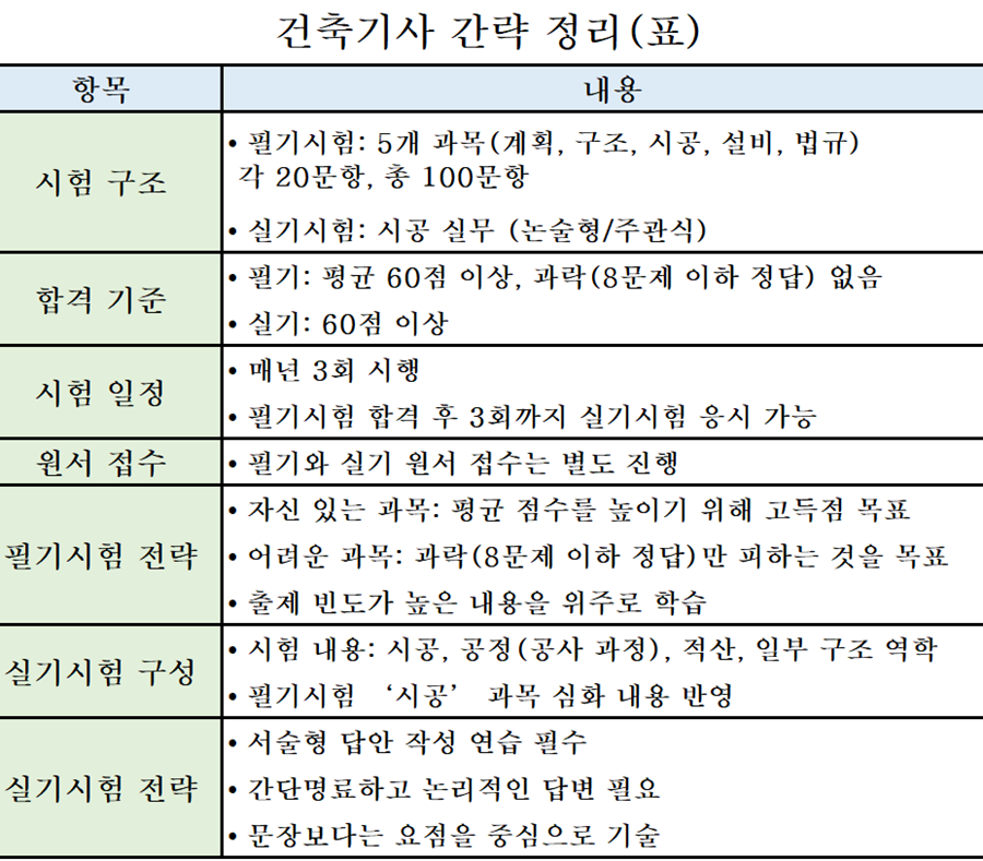 건축기사 시험은 정확한 계획과 전략을 세우고 준비한다면 누구나 도전할 수 있습니다. 시험의 구조와 합격 기준을 잘 이해하고 효율적인 학습법으로 꾸준히 준비해 나가세요.