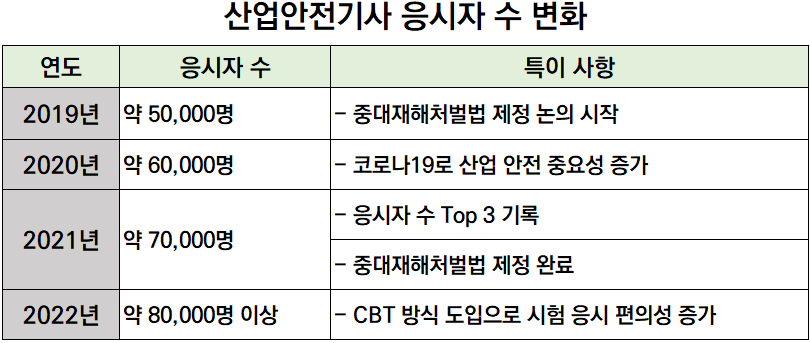최근 산업안전기사 시험 응시자가 급격히 증가하고 있는 추세입니다. 실제로 2021년 통계에 따르면 산업안전기사는 기사 등급 자격증 중 응시자 수 TOP 3에 오를 정도로 많은 관심을 받고 있습니다.