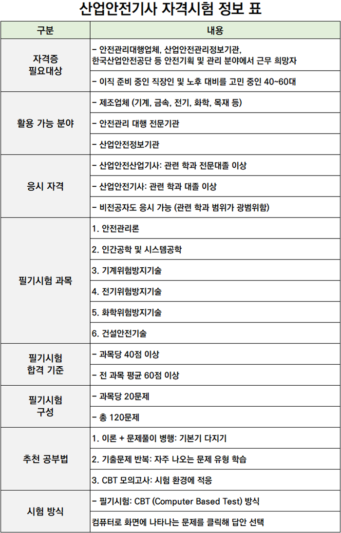 특히, 이직을 고민 중인 직장인이나 노후 대비가 필요한 40~60대 분들께 강력히 추천드리고 싶습니다. 이 자격증은 산업 전반에서 높은 수요를 자랑하며, 기계, 금속, 전기, 화학, 목재 등 다양한 제조업 분야뿐 아니라 안전관리 대행 전문기관이나 안전관리정보기관에서도 구인구직이 활발히 이루어지고 있습니다.