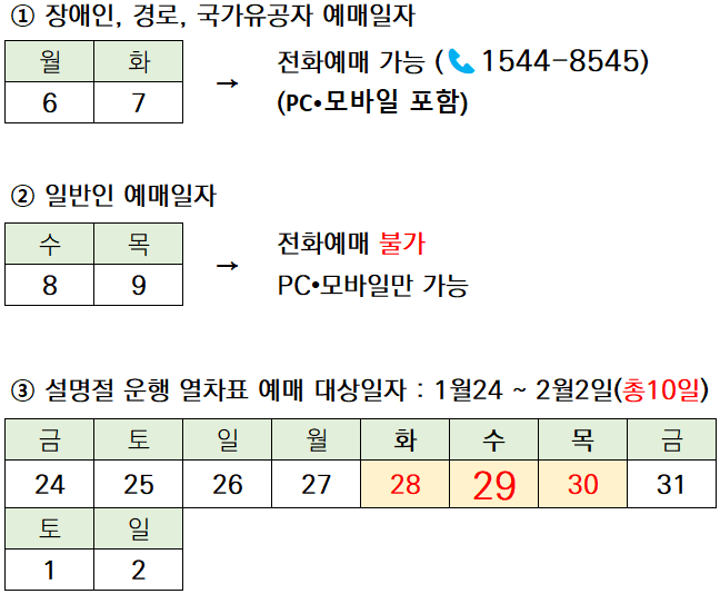 • 설 승차권 예매는 PC, 모바일, 전화예매(일부)로 시행하며, 역, 판매대리점, TMO에서 구입하실 수 없습니다.(장애인.경로,국가유공자는 25.01.06(월)~01.07(화)까지 전화예매가능)