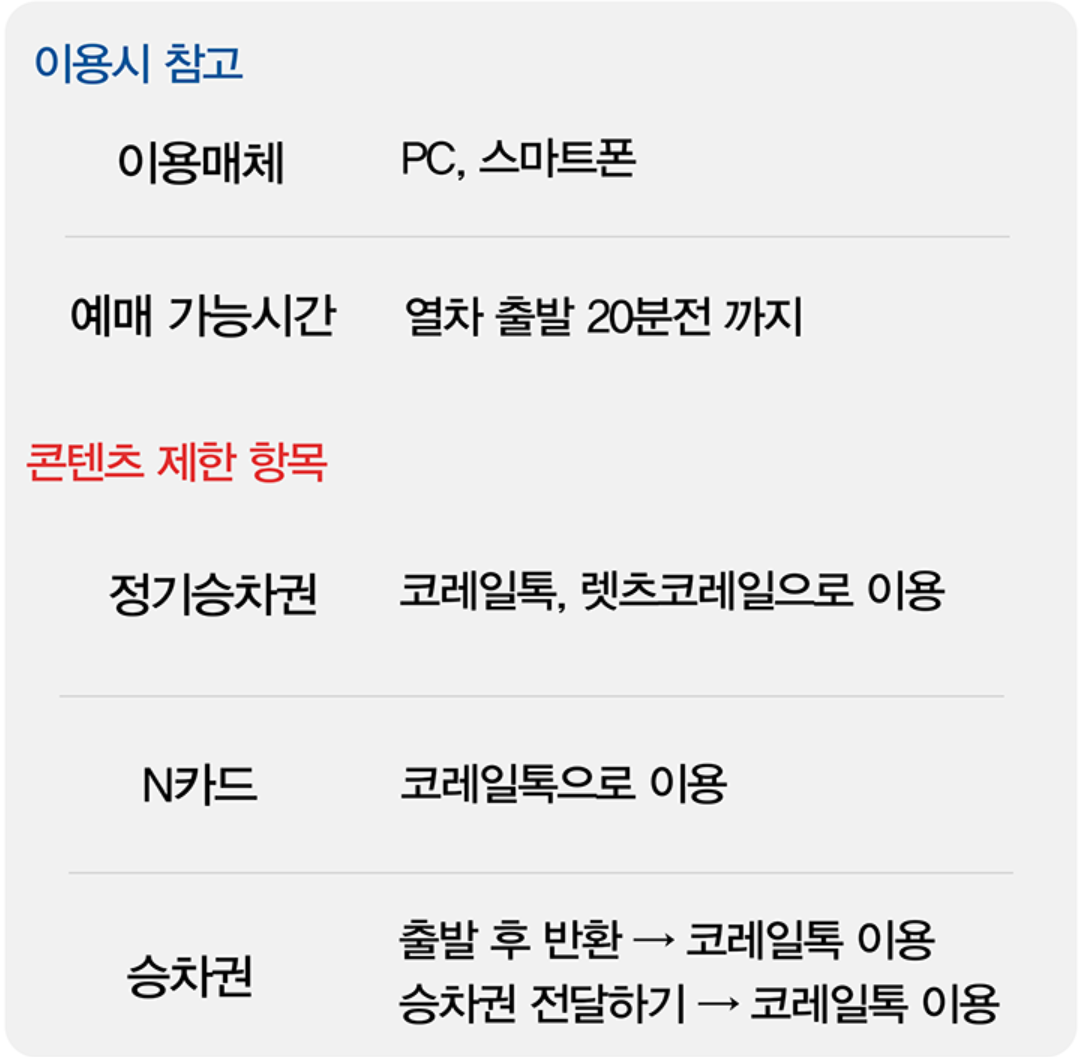 • 동일(인접) 시간대 중복 예매, 단거리 구간 예매, 승차구간 축소를 제한합니다.