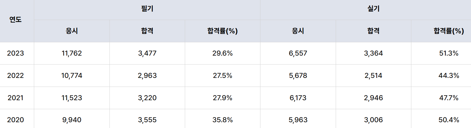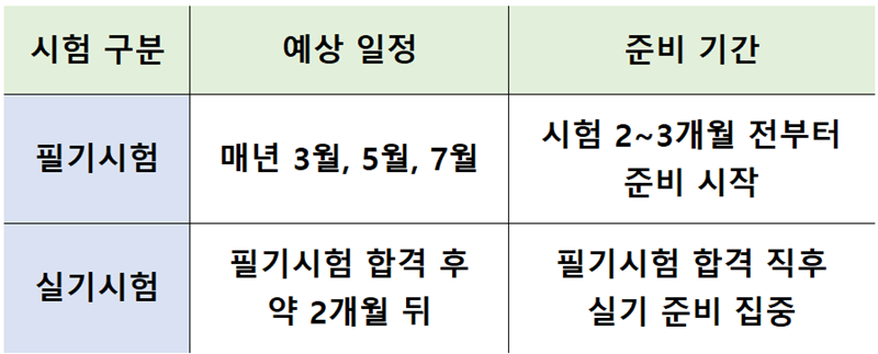 필기시험 일정 : 보통 매년 3월, 5월, 7월에 시행됩니다. 따라서 2~3개월의 학습 기간을 계획에 포함시켜야 합니다.