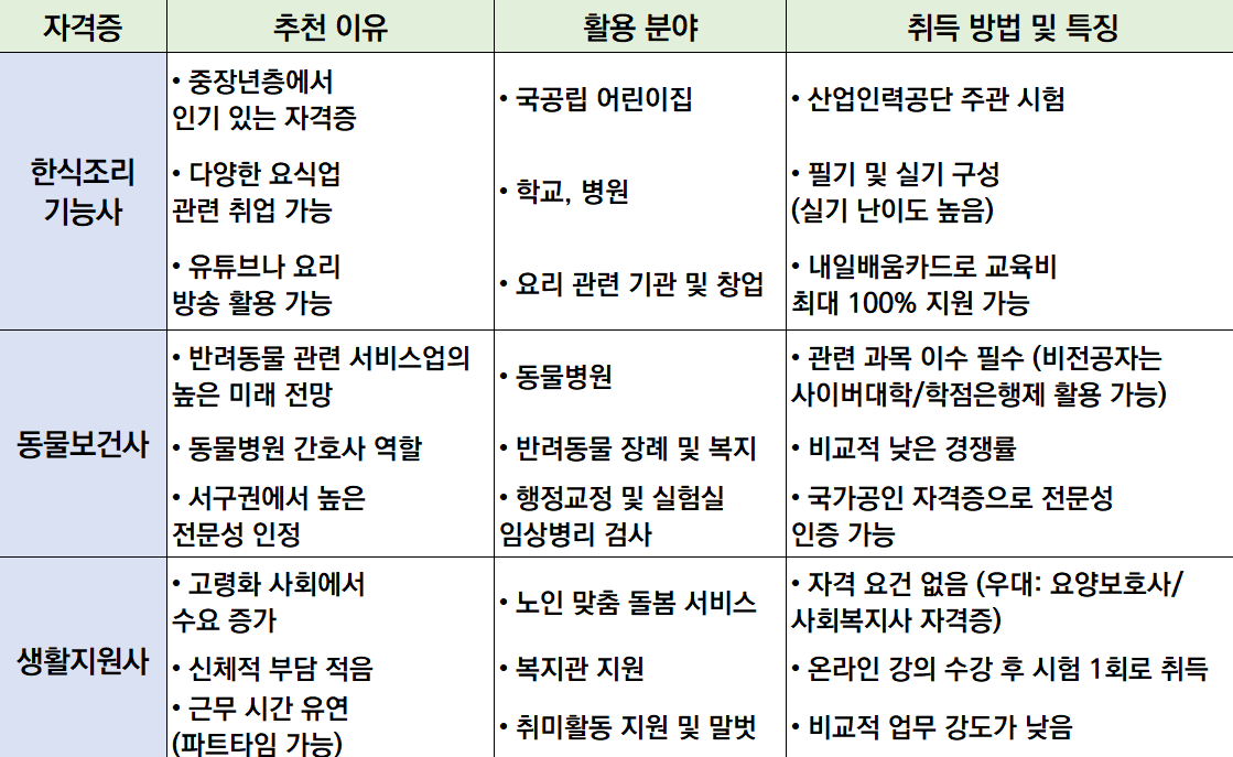 오늘 소개해드린 한식조리기능사, 동물간호복지사, 생활지원사는 모두 50대 이상 여성분들이 실질적으로 도전할 수 있는 자격증들입니다. 각 자격증은 취업과 창업에 새로운 길을 열어줄 뿐만 아니라, 삶의 보람과 경제적 안정까지 가져다줄 수 있습니다.