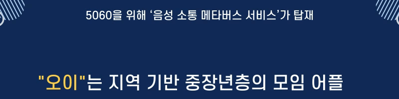 스페인어로 ‘비바라비다’는 ‘인생이여! 만세!’란 의미다. 오이는 지역 기반 중장년층의 모임 어플이다. 등산, 골프, 공예, 여행, 노래 악기 등 나와 같은 취미를 가진 이들의 모임에 참여하거나 모임을 직접 운영할 수 있는 기능을 제공한다. ‘오이’에는 채팅보다는 음성으로 이야기하는 것이 친숙한 5060을 위해 ‘음성 소통 메타버스 서비스’가 탑재돼 있다.