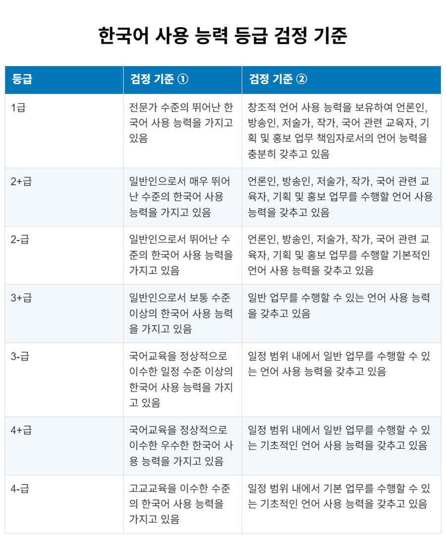 이제 KBS 한국어 능력 시험의 결과가 어떻게 나오는지 살펴보겠습니다. 시험은 1급부터 4급까지 등급으로 나뉘며, 해당 점수에 미치지 못하면 무급으로 처리됩니다. 특히 2급에서 4급 사이에는 플러스 등급(+)과 마이너스 등급(-)으로 세분화되어 있습니다. 급수는 성적표를 통해 확인할 수 있으며, 아래 표를 통해 급수표를 참고하시면 더욱 이해가 쉬울 것입니다.